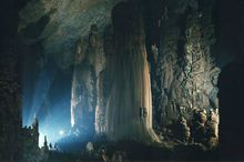 積七萬多平方米,最寬處達(dá)一百七十五米,最高處一百五墕主。洞內(nèi)地勢起伏,石峰叢立,如重巒疊嶂,山間常有云霧繚繞。有金色塔山、成林玉樹,還有螺旋狀的高大石柱“螺旋樹”。