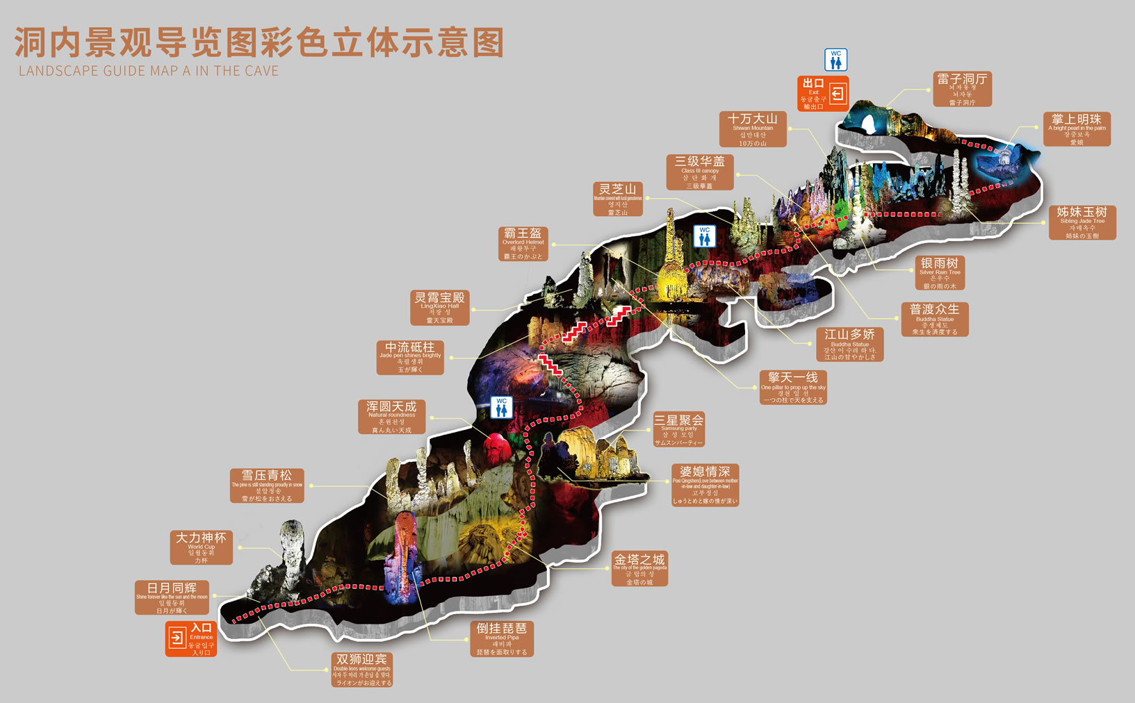 3、由于游客進(jìn)入帶來二氧化碳,洞中很多美麗透明的鐘乳石已變黃了,所以更請注意不要吸煙。