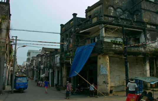 據(jù)史書記載,定安古城從籌建到1519年竣工共費(fèi)時(shí)13年。城圍長近千米,高四米多,寬五米多,開有東、南、西城門,各建有城樓。北門是1545年才開的,后來因不堪倭寇的騷擾,曾經(jīng)堵上過,直到1690年才又重開。古城的城墻在建國初期就已經(jīng)被拆毀了,城門這一塊大概是因?yàn)榭此Y(jié)實(shí)牢固,便利用來建了樓房,因此還被保存下來。城門洞里放著兩只卸了龍頭的龍舟,已經(jīng)很舊,架在木樁子上。地是用青石板鋪設(shè)的,經(jīng)過幾百年人來人往,石板被磨得很薄。門洞里的墻面上也是一塊塊青石磚砌的,摸上去很干爽,一點(diǎn)也沒有陳年的霉味。