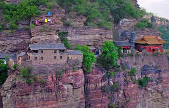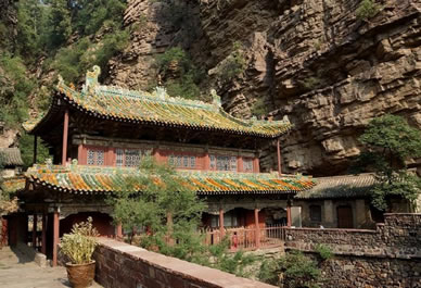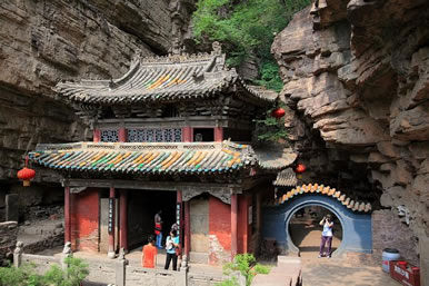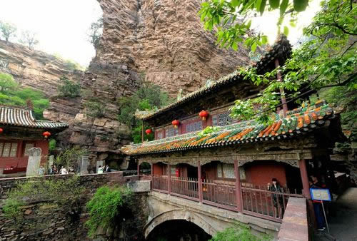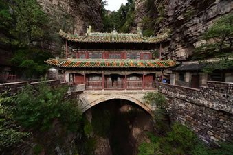 一絕“橋樓殿”。橋凌駕于百仞峭壁之間,仰視藍天一線,俯首萬丈深淵。形制如同趙州橋敞肩拱式。橋上建樓,云飛樓動,樓內(nèi)建殿,殿內(nèi)三尊大佛。真是“千丈虹橋望入微,天光云彩共樓飛”,不是仙境勝似仙境,疑是天堂落塵!,F(xiàn)為中國三大懸空寺之一。