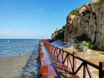 望海長廊,距鷹角亭50米,廊長70米。游人逗留廊中,遠眺渤海碧波,白云沙鷗,帆船巨艦;近賞淺水明澈,微波清蕩,看拾貝之人歡笑,聽大海之波濤,令人流連忘返。海邊建“浴日亭”,其匾額為嚴濟慈先生所寫。廊中彩繪雕梁畫柱,栩栩如生。兩側是由方亭和八角亭組成,分別采用了古代園林常見構景手段—借景和透景的方法,吸收了北京頤和園和承德外八廟長廊的特點,繪畫了北戴河24景和北戴河206個民間故事傳說,以花鳥、魚蟲、人物等不同圖案,這種彩繪叫做“蘇式彩繪”。高于蘇式彩繪的要屬“旋子彩繪”畫面用簡化式的渦卷瓣旋花,有時也可以畫龍鳳,一般用于次要宮殿式寺廟中。等級最高的彩繪要屬“和璽彩繪”。中間的畫面由不同的龍或鳳的圖案組成,間補以花卉圖案,金碧輝煌,十分壯麗。 |