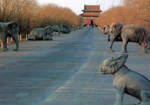昌陵內(nèi)葬仁宗嘉慶皇帝和孝淑;屎,位于泰陵西側(cè),于嘉慶八年(1803年)建成,建筑形式與泰陵大同小異,規(guī)模并列。乾隆傳位給嘉慶帝時(shí)并為他在泰陵南西南一公里的地方,選好陵址。從前面的神道到最后的寶城,一應(yīng)俱全,但昌陵的寶城比泰陵還高大。昌陵的隆恩殿很有特色,地面鋪的是很貴重的黃色花斑石,黃色的方石板上有天然雅致的紫色花紋,素有“滿堂寶石”之稱。嘉慶皇帝的皇后陵昌西陵的回音石、回音壁,回音效果絕妙,可與北京天壇的回音壁相媲美。昌陵西邊是昌西陵和昌妃園寢,分別葬著孝和;屎蠛湾鷭宓热恕