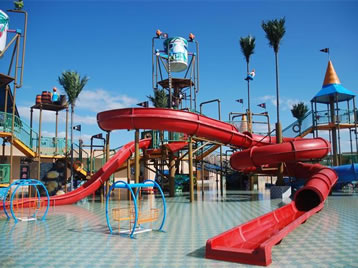 寶貝水城:小孩子的玩水樂園、歡樂的造夢(mèng)空間。典型設(shè)備包括蝴蝶滑梯、青龍滑梯、鱷魚滑梯等設(shè)備,還有蝸牛號(hào)、椰果派、水風(fēng)車、向陽花、七彩蘑菇、彩虹門、三色花、鳥語花香、小妖精等可噴水可觀賞的童趣水景。寶貝水城色彩鮮艷,設(shè)施眾多,小孩們可以盡情嬉戲玩耍,激發(fā)兒童無窮的想象力和創(chuàng)造力。
