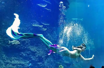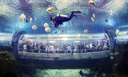 海底世界水族館飼養(yǎng)著來(lái)自世界各地的海洋動(dòng)物200多種,共10,000多艉(頭),其中有大量國(guó)家一級(jí)、二級(jí)珍稀保護(hù)動(dòng)物,檸檬鯊、豹紋鯊、護(hù)士鯊、海豚、江豚、綠海龜、海獅、海豹、蝠鲼、海狗供游人觀賞。270度環(huán)形的亞克力玻璃圍成的海底隧道全長(zhǎng)100米左右,五光十色的珊瑚環(huán)繞在您的周圍,迷人的海底動(dòng)植物盡收眼底。透過(guò)窗口還可以看到一個(gè)古羅馬被海水淹沒(méi)城市的石像造景。海豚表演館占地面積1萬(wàn)平方米,建筑面積3,000平方米,總貯水量200萬(wàn)千克,能同時(shí)容納2000多人同時(shí)觀看表演,以展示生活在海洋中哺乳動(dòng)物的海獸表演為主,是一座具有國(guó)際標(biāo)準(zhǔn)的海洋動(dòng)物表演劇場(chǎng)。游客在此可以看到聰明可愛(ài)的海豚和滑稽可笑的海獅聯(lián)袂上演精彩紛呈的各項(xiàng)表演:海獅獻(xiàn)上迪斯科、倒立平衡、一獅兩球、套彩圈、單手倒立、頂球過(guò)障礙、親吻、水中交誼舞等一系列惟妙惟肖的表演;海豚上演的水中芭蕾舞、踢足球、環(huán)場(chǎng)鞠躬跳躍、伴著樂(lè)曲引吭高歌以及充分展示海豚智力的各種表演活動(dòng)。