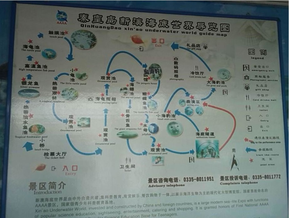 秦皇島火車站有公交車可直達(dá)景區(qū)。一期工程總投資人民幣1. 2億元,建筑面積1.3萬(wàn)平方米,總儲(chǔ)水量約500.0000立升。主要由小池區(qū)、江豚龍宮、觸摸池、珊瑚海、雨林傳奇、企鵝館、海豹表演、海底探奇、深海之旅、科普展廳、科普教室、鳥雨林、巨蟲公園及海洋精品店、觀海鱷魚餐廳 等部分組成是集科普教育、環(huán)保教育、休閑娛樂(lè)于一體的科普教育基地。