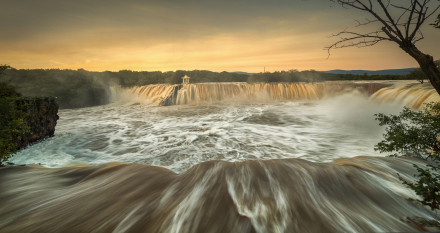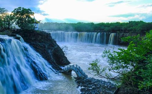 吊水樓瀑布位于鏡泊湖北頭。是景區(qū)的特級自然景源(世界級),酷似聞名世界的“尼亞加拉大瀑布”。平水期時,瀑布一般幅寬五六十米,落差十二米。但在汛期,最高落差僅十余米,瀑布最大幅寬可達四百余米,從南、西、北三個方向以排山倒海之勢從熔巖壁頂直撲黑龍?zhí)。似浮云堆雪,白霧四濺,百米之外,水珠鋪面;又似銀河倒掛,彩練懸崖,奔騰咆哮,聲如奔雷。與貴洲的黃果樹瀑布、黃河壺口瀑布、九寨溝諾日朗瀑布、臺灣的文龍瀑布、廬山的三疊泉瀑布并稱中國六大名瀑。