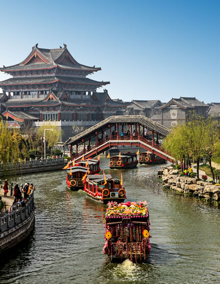 清明上河園位于開(kāi)封古城內(nèi)西北隅,是以宋代張擇端的名《清明上河圖》為藍(lán)本,集中再現(xiàn)原圖風(fēng)物景觀的大型宋代民俗風(fēng)情游樂(lè)園,是國(guó)家AAAAA級(jí)景區(qū)。占地面積510畝,主要建筑有城門(mén)樓、虹橋、街景、店鋪、河道、碼頭、船坊等。園區(qū)按《清明上河圖》的原始布局,集中展現(xiàn)宋代諸如酒樓、茶肆、當(dāng)鋪、汴繡、官瓷、年畫(huà)等現(xiàn)場(chǎng)制作;薈集民間游藝、雜耍、盤(pán)鼓表演;神課算命、博彩、斗雞、斗狗等京都風(fēng)情,并根據(jù)宋氏歷史故事表演“文包武楊”及宋代婚禮習(xí)俗等節(jié)目。