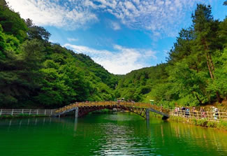 通天湖:原為天崗山發(fā)電站供水總庫,水面110余畝,居高臨下,湖光山色,交相輝映。二期開發(fā)新建的環(huán)湖棧道、彩虹橋依山傍水,幽靜迷人。湖中的通幽半島,樹高林密,鳥語花香,神奇而壯觀,非水路而莫登。