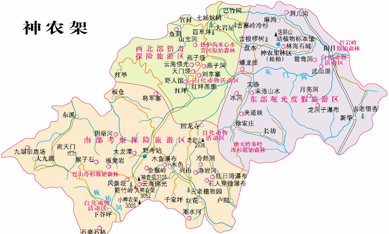 神農(nóng)架是我國(guó)內(nèi)陸保存完好的唯一一片綠洲和世界中緯度地區(qū)唯一的一塊綠色寶地。它所擁有的在當(dāng)今世界中緯度地區(qū)唯一保持完好的亞熱帶森林生態(tài)系統(tǒng),是最富特色的壟斷性的世界級(jí)旅游資源,動(dòng)植物區(qū)系成分豐富多彩,古老、特有而且珍稀。蒼勁挺拔的冷杉、古樸郁香的巖柏、雍容華貴的梭羅、風(fēng)度翩翩的珙桐、獨(dú)占一方的鐵堅(jiān)杉,枝繁葉茂,遮天蔽日;金絲猴、白熊、蘇門羚、大鯢以及白鸛、白鶴、金雕等走獸飛禽出沒草叢,翔天林間。一切是那樣地和諧寧靜,自在安詳。這里還有著優(yōu)美而古老的傳說和古樸而神秘的民風(fēng)民俗,人與自然其同構(gòu)成我國(guó)內(nèi)地的高山原始生態(tài)文化圈。神農(nóng)氏嘗草采藥的傳說、“野人”之謎、漢民族神話史詩《黑暗傳》、川鄂古鹽道、土家婚俗、山鄉(xiāng)情韻都具有令人神往的誘惑力。這里山峰瑰麗,清泉甘冽,風(fēng)景絕妙。神農(nóng)頂雄踞“華中第一峰”,風(fēng)景埡名躋“神農(nóng)第一景”;紅坪峽谷、關(guān)門河峽谷、夾道河峽谷、野馬河峽谷雄偉壯觀;陰峪河、沿渡河、香溪河、大九湖風(fēng)光綺麗;萬燕棲息的燕子洞、時(shí)冷時(shí)熱的冷熱洞、盛夏冰封的冰洞、一天三潮的潮水洞、雷響出魚的錢魚洞令人叫絕;流泉飛瀑、云海佛光皆為大觀!