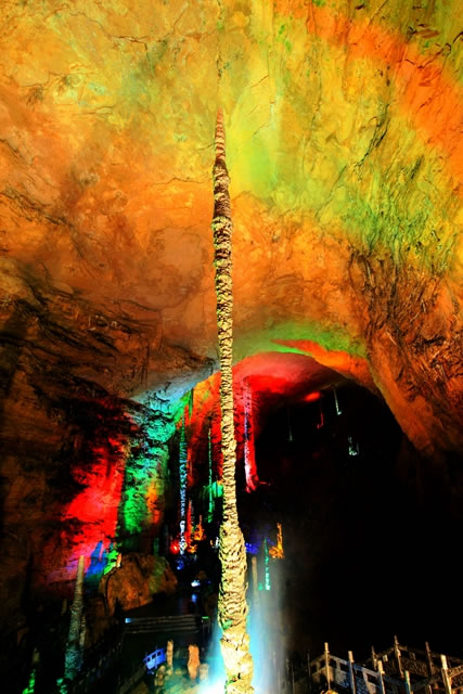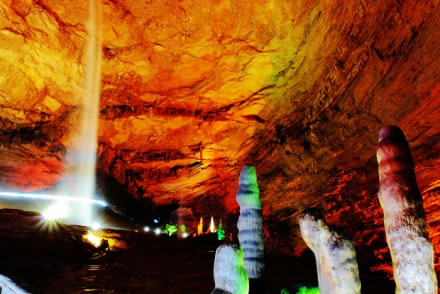 飛流直下三千尺,疑是銀河落九天。天仙水位于黃龍洞天仙宮景區(qū),是我國已開發(fā)的溶洞中流量最大、落差最高的一個(gè)懸空瀑布。它的落差高達(dá)27.3米,從洞頂石窟直瀉而下,飛珠濺玉,氣勢磅礴,四季長流不竭。