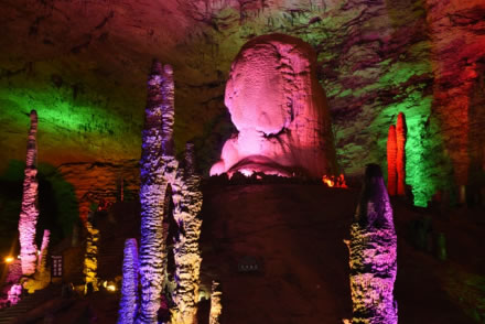 黃龍洞以立體的洞穴結(jié)構(gòu),龐大的洞穴空間,寬闊的廳堂及數(shù)以萬計(jì)的石筍,高大的洞穴瀑布,水陸兼?zhèn)涞挠斡[線等優(yōu)勢構(gòu)成了極具特色的游覽洞穴,洞內(nèi)有1庫、2河、3潭、4瀑、13大廳、98廊,以及幾十座山峰,上千個(gè)白玉池和近萬根石筍。由石灰質(zhì)溶液凝結(jié)而成的石鐘乳、石筍、石柱、石花、石幔、石枝、石管、石珍珠、石珊瑚等遍布其中,無所不奇,無奇不有,仿佛一座神奇的地下“魔宮”。黃龍洞現(xiàn)已開放有龍舞廳、響水河、天柱街、天仙瀑、龍宮等6大游覽區(qū),主要景觀有定海神針、萬年雪松、龍王寶座、火箭升空、花果山、天仙瀑布、海螺吹天、雙門迎賓、滄海桑田、黃土高坡等100多個(gè)。