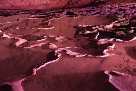 千丘田科學(xué)名稱為“流石壩”,也叫“酸田”, 它是水平流動的水在洞底流動過程中形成的碳酸鈣沉積。黃龍洞內(nèi)大大小小的千丘田不計(jì)其數(shù),縱橫阡陌,形似一片片頗為壯觀的田園風(fēng)光。