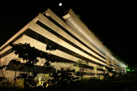 黃龍音樂廳位于生態(tài)廣場入口處,由黃龍洞投資股份有限公司按國際標(biāo)準(zhǔn)建設(shè),建筑面積為4970平方米,總投資1.6億元,座位818個(gè)。該音樂廳背靠植被茂盛的黃龍洞山體,面朝浩瀚的稻田,南鄰潺潺東流的索溪水。整個(gè)建筑為框剪式結(jié)構(gòu),3250平方米斜坡面屋頂全部為綠茵花草屋蓋,是全球最大的綠化屋頂;其外墻由當(dāng)?shù)厍嗍搸r構(gòu)建成的音符弦線幕墻與自然融合一體,形如一本即將展開等待世人閱讀的張家界文化寶典,又如鑲嵌在張家界的一塊翡翠,被譽(yù)為“世界環(huán)境最美音樂廳”。