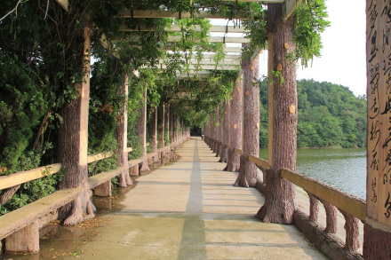 紫藤文化長(zhǎng)廊位于三仙湖東北岸,建于2007年10月。長(zhǎng)133米,寬3.8米,高4米,長(zhǎng)廊中有76根柱子,柱子上有從古至今的76位名人題寫(xiě)的詩(shī)詞。紫藤文化長(zhǎng)廊6個(gè)大字,由原中央電視臺(tái)副總編輯、中央電視臺(tái)書(shū)畫(huà)院院長(zhǎng)趙立凡寫(xiě)。