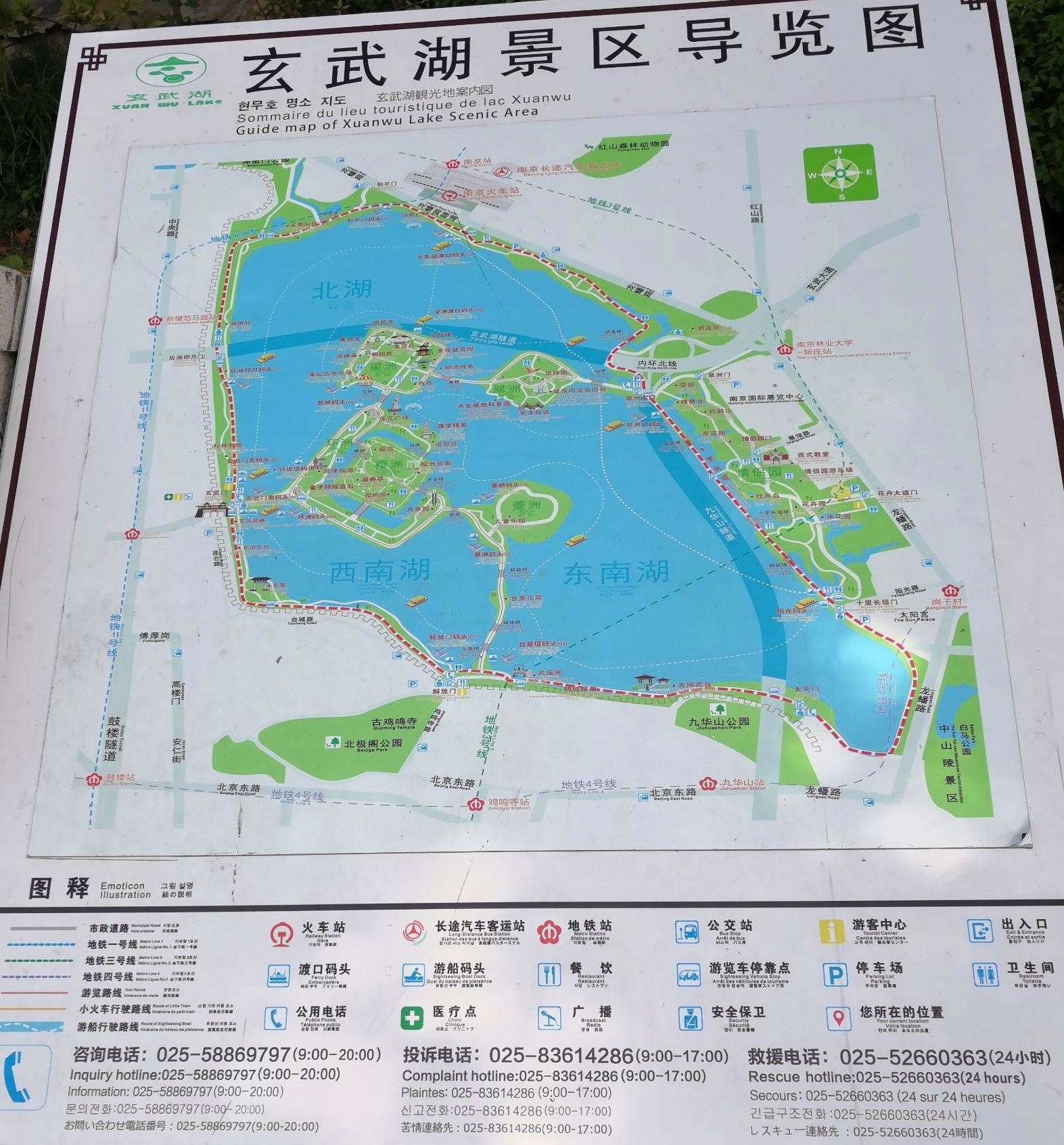玄武湖環(huán)湖路全長(zhǎng)9.8公里,總面積56萬(wàn)平方米,周圍分部著眾多的南京著名景點(diǎn),環(huán)湖路西南半邊為南京明城墻圍繞,城墻外便是繁華的都市,靜與鬧僅一墻之隔。北岸自西向東依次為神策門(mén)公園、南京火車站,東岸自北向南依次為南京國(guó)際展覽中心、情侶園、白馬公園,南岸自東向西依次為太平門(mén)、九華山公園、古閱武臺(tái)、南京武廟、雞鳴寺、解放門(mén)、臺(tái)城,西岸自南向北依次為玄圃、玄武門(mén)、杉林氧吧、萬(wàn)三花園,其中西岸和南岸均有南京明城墻為依。