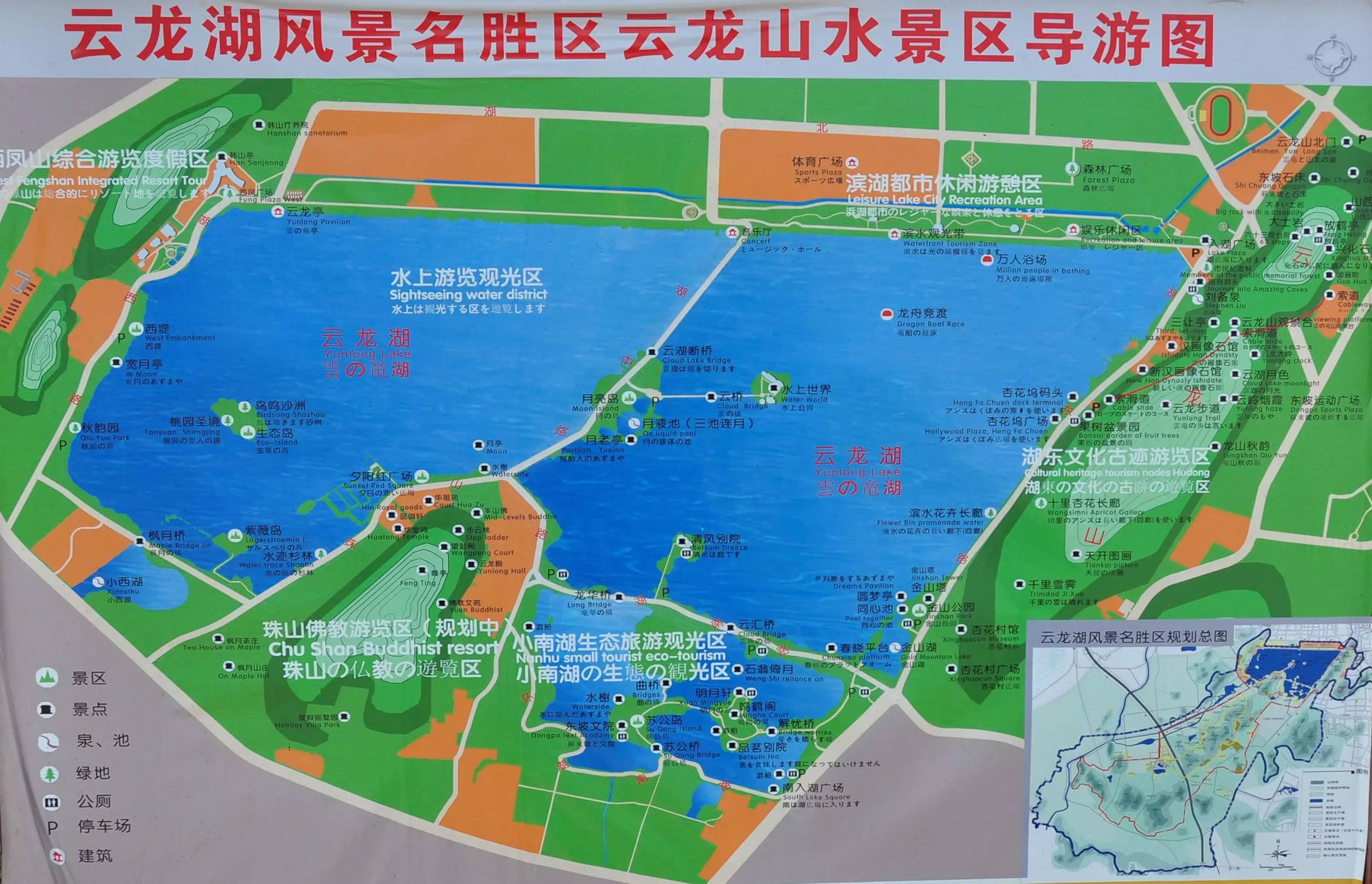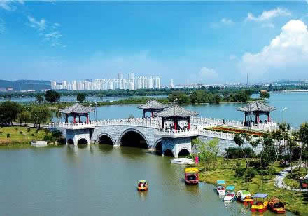 小南湖:是云龍湖的有機(jī)組成部分,它位于云龍湖南岸,其水全部來(lái)自云龍湖,兩者之水從橋下相通,但兩湖之間又被一條道路和綠化帶隔開(kāi),所以又可單稱小南湖。小南湖原是云龍湖南部的一大片洼地。