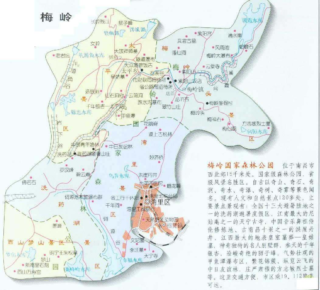 梅嶺風(fēng)景名勝區(qū)位于南昌市西郊15公里處,在江南最大的“飛來峰”上,因西漢梅福于此修道而得名。又因位于城區(qū)之西,復(fù)又名西山。梅嶺西臨鄱陽湖,北與廬山對峙,方圓150平方公里,是著名的避暑勝地,也是中國古典音律和道教凈明宗的發(fā)源地。