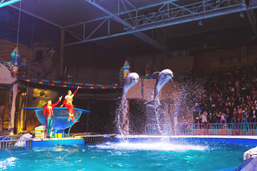 奇幻的360度多維水秀場(chǎng),一段白鯨、海豚的動(dòng)情表演,一段王子、公主的浪漫愛(ài)情,與月光天使、海盜聯(lián)袂演繹真人版的“人魚童話”。多種藝術(shù)形式、多重情感體驗(yàn),國(guó)際化表演陣容,帶給游客夢(mèng)幻動(dòng)人的童話故事。