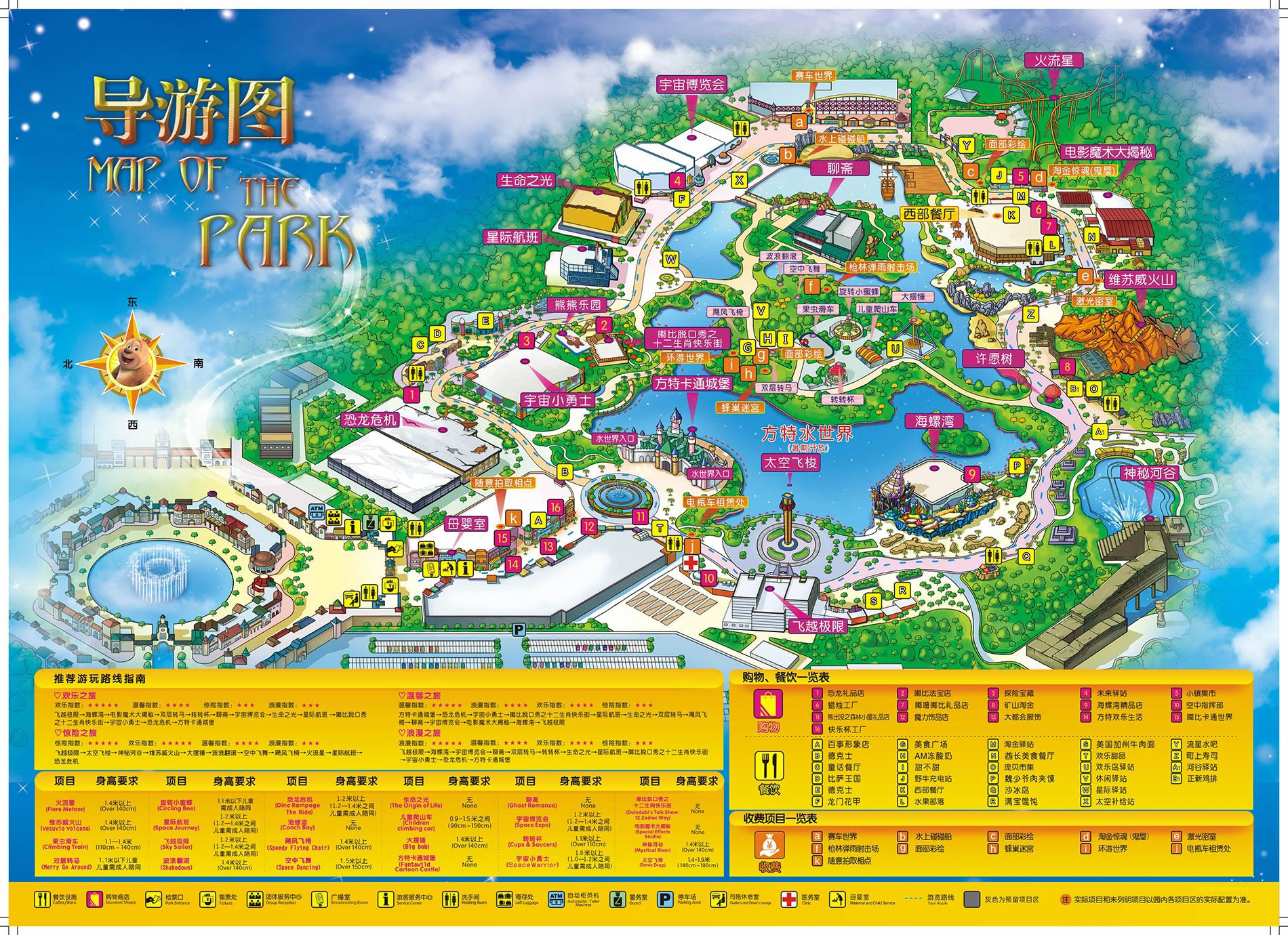 飛越極限→太空飛梭→神秘河谷→維蘇威火山→大擺錘→火流星→颶風飛椅→空中飛舞→瘋狂成語→恐龍危機