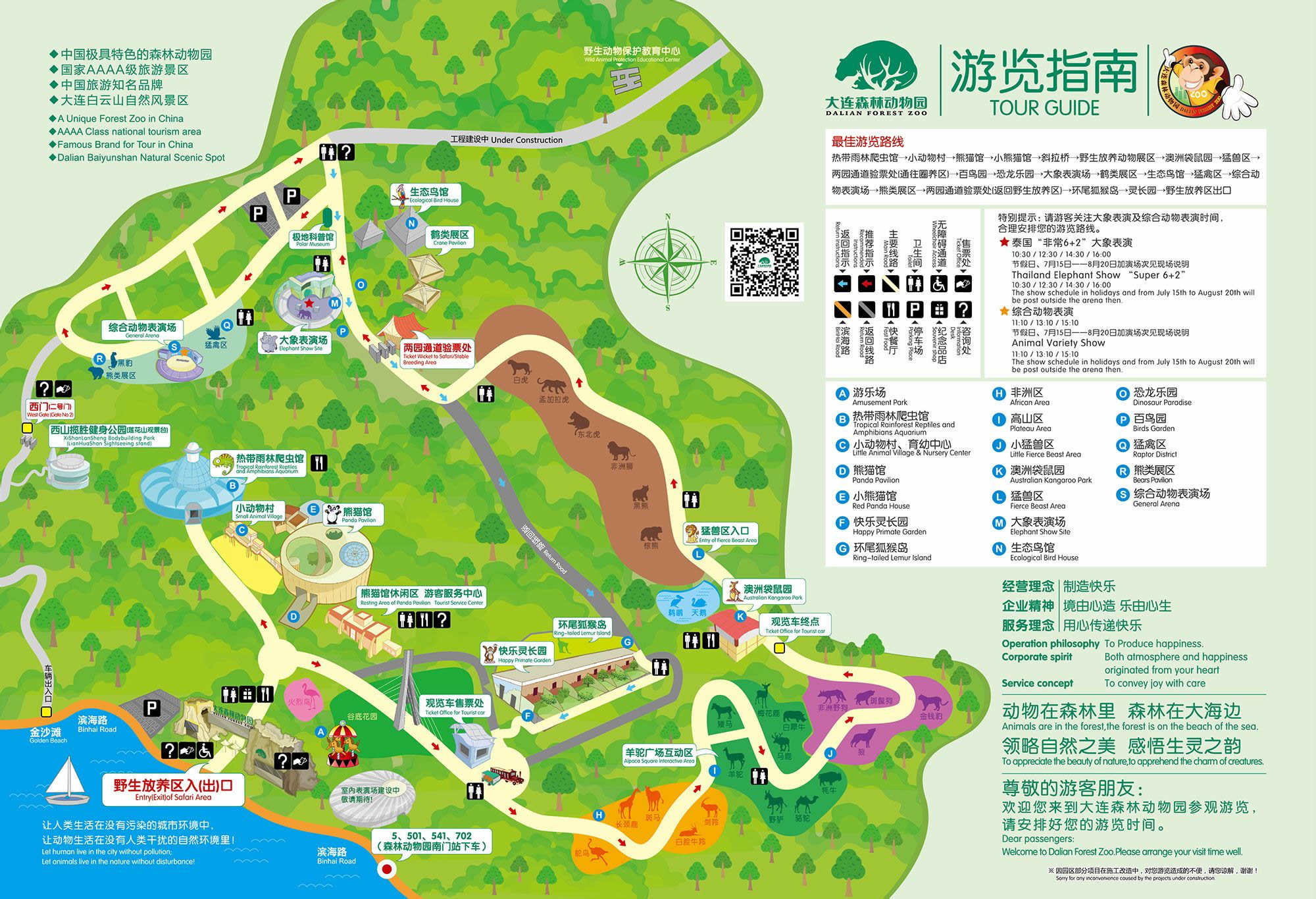 大連森林動物園在動物品種上主要突出新、奇、特;在動物種群上主要突出少而精;在展養(yǎng)方式上以圈養(yǎng)和散養(yǎng)為主,突出熱門主題展示、注重"全天候"及人與動物的交流;在環(huán)境處理上以自然風光為主,形成自然景觀與人文景觀有機結(jié)合。