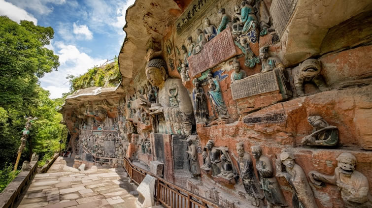 大足石刻景區(qū)位于重慶市大足區(qū),是世界文化遺產(chǎn)、國(guó)家5A級(jí)旅游景區(qū),也是世界八大石窟之一。景區(qū)始建于初唐,鼎盛于兩宋,代表了公元9至13世紀(jì)世界石窟藝術(shù)的最高水平,以寶頂山、北山、南山、石門山、石篆山“五山”為代表,共有造像5萬(wàn)余尊,銘文10萬(wàn)余字。大足石刻是石窟藝術(shù)史上的晚期杰作,將佛教、道教、儒家思想融合,展現(xiàn)了宋代以來(lái)的社會(huì)生活、信仰與藝術(shù)成就,被譽(yù)為“東方藝術(shù)明珠”。