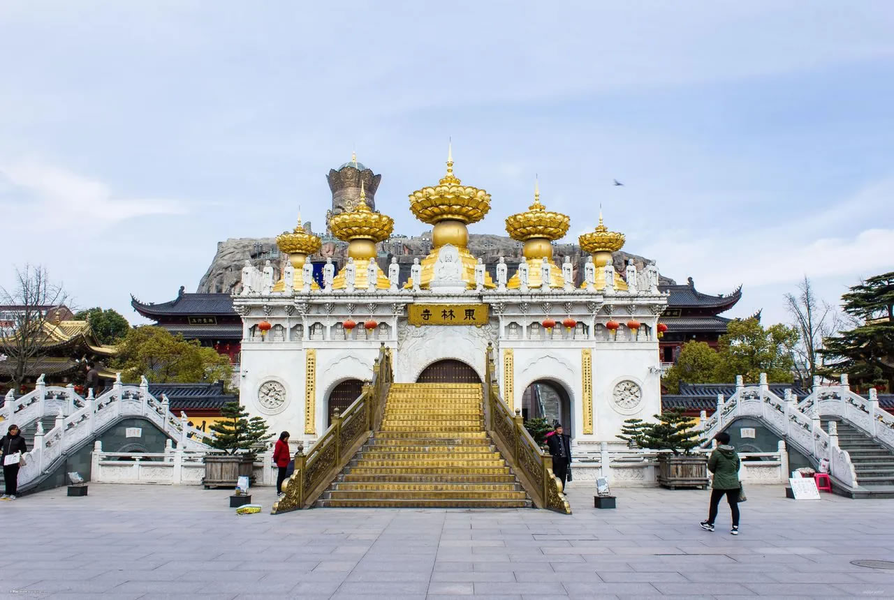 東林寺,位于上海市金山區(qū)朱涇鎮(zhèn)。其原名觀音堂,元至大元年(1308年),由僧侶妙因創(chuàng)建。元皇慶二年(1313年)改為東林禪寺。東林寺占地24.07畝,為浦南地區(qū)單體建筑面積最大的元、明、清建筑群,建筑風(fēng)格獨特,寺廟主體建筑依著一座高大的仿假山建筑而建,形成山寺合一。寺廟的新建部分融合了現(xiàn)代設(shè)計元素,在保留傳統(tǒng)廟宇氣息的同時,展現(xiàn)出新穎獨特的景觀。尤其是寺廟中金碧輝煌的建筑和雕塑,展示出中國傳統(tǒng)工藝的精湛與華麗。分圓通寶殿、大雄寶殿、觀音閣、善財?shù)、千佛門、鐘樓、鼓樓、金愿橋、五佛冠、金蓮池(景泰藍(lán)善財童子)等景點。