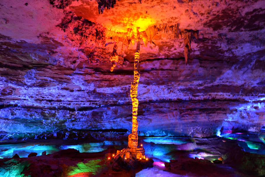 - 水洞:第一層水洞蜿蜒,原可乘船,現(xiàn)改浮橋游覽,兩岸石柱、石筍密布,燈光下如夢如幻。