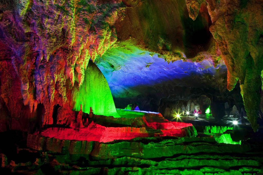 - 特色:兩億多年地殼變化形成,分四層,已開(kāi)放三層,總面積3萬(wàn)平方米,游程1.5公里。洞內(nèi)石筍、石柱、石幔千姿百態(tài),有“龍骨塔”等大型景觀,摩崖石刻群(關(guān)山月題寫“寶晶宮”)。