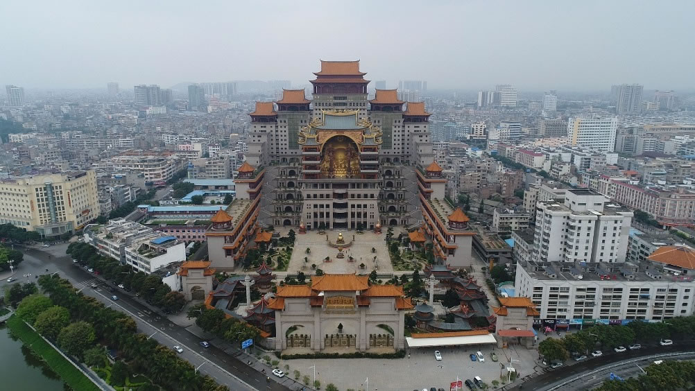 - 地理位置:廣西玉林市玉州區(qū)江濱路461號,國家AAAA級景區(qū),占地70畝,建筑面積14萬平方米,主樓21層高108米,被譽為“玉林版布達拉宮”,集雕塑藝術(shù)、民俗文化、珍寶展示于一體。