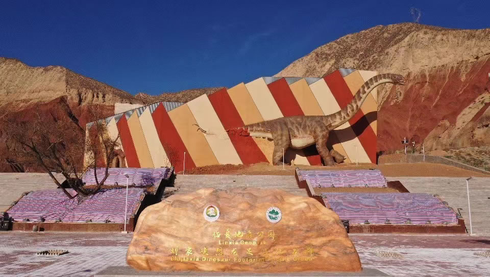 - 核心特色:以白堊紀(jì)恐龍足印群為核心,揭露面積2800平方米,含11類150組1831個(gè)足跡,最大蜥腳類足印長150厘米、寬120厘米,步幅375厘米,創(chuàng)世界之最。配套恐龍臥跡、尾部拖痕、糞跡化石及蘭州龍、劉家峽黃河巨龍等骨骼化石,地質(zhì)博物館、5D影院、游步道等設(shè)施完善,兼具科研、科普與旅游價(jià)值。
