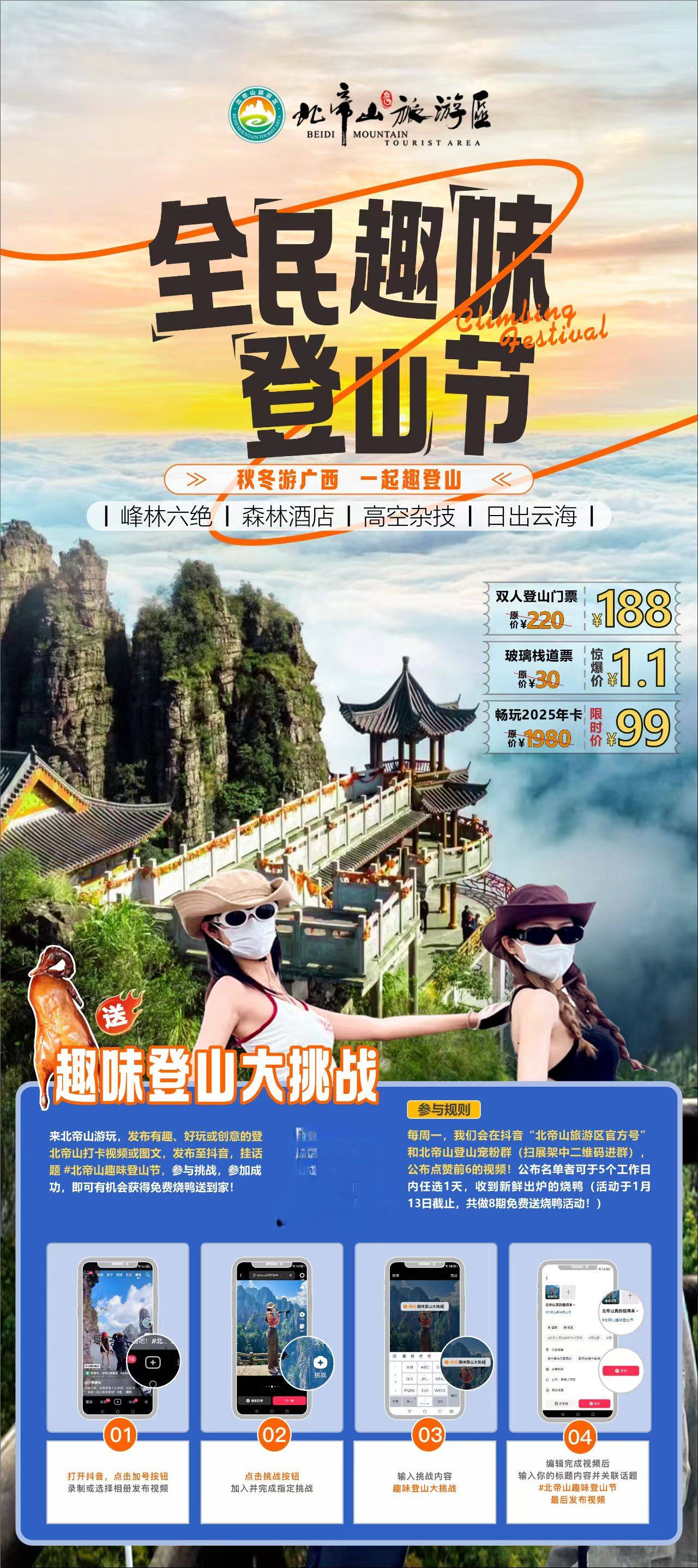 北帝山喊你來打卡!把你的鏡頭對(duì)準(zhǔn)北帝山,無論是打卡的、炫酷的、或搞笑的,只你大膽曬出來!發(fā)布至抖音,參加趣味登山大挑戰(zhàn)掛話題#北帝山趣味登山節(jié),即可參加成功贏免費(fèi)燒鴨送到家!