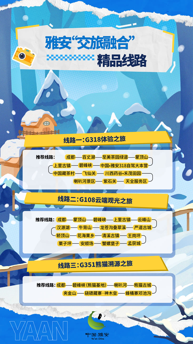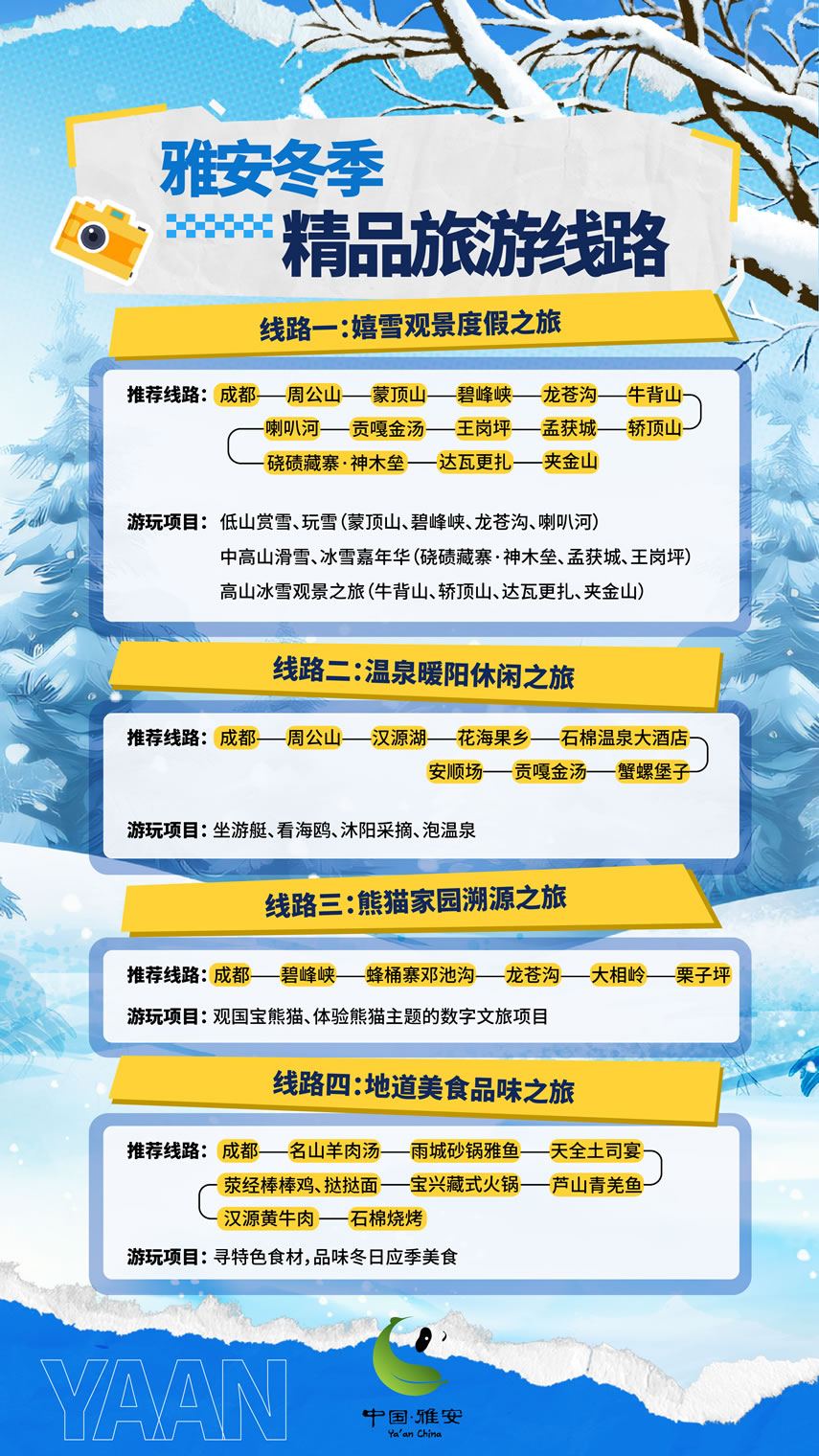 這個(gè)冬天,雅安市圍繞冰雪、溫泉、熊貓、美食,推出4條冬季精品旅游線路,圍繞國(guó)道318、108等交旅資源,推出3條“交旅融合”精品線路,最大程度滿足游客的冬游需求。將以冰雪為序,溫泉為媒,熊貓為邀,美食為禮,誠(chéng)邀四方游客共赴一場(chǎng)難忘的旅行盛宴,邀請(qǐng)各地游客來(lái)“綠美雅安 熊貓家園”暢享冰天雪地的快樂,盡享溫泉暖陽(yáng)的愜意,邂逅“風(fēng)花雪月”的故事。
