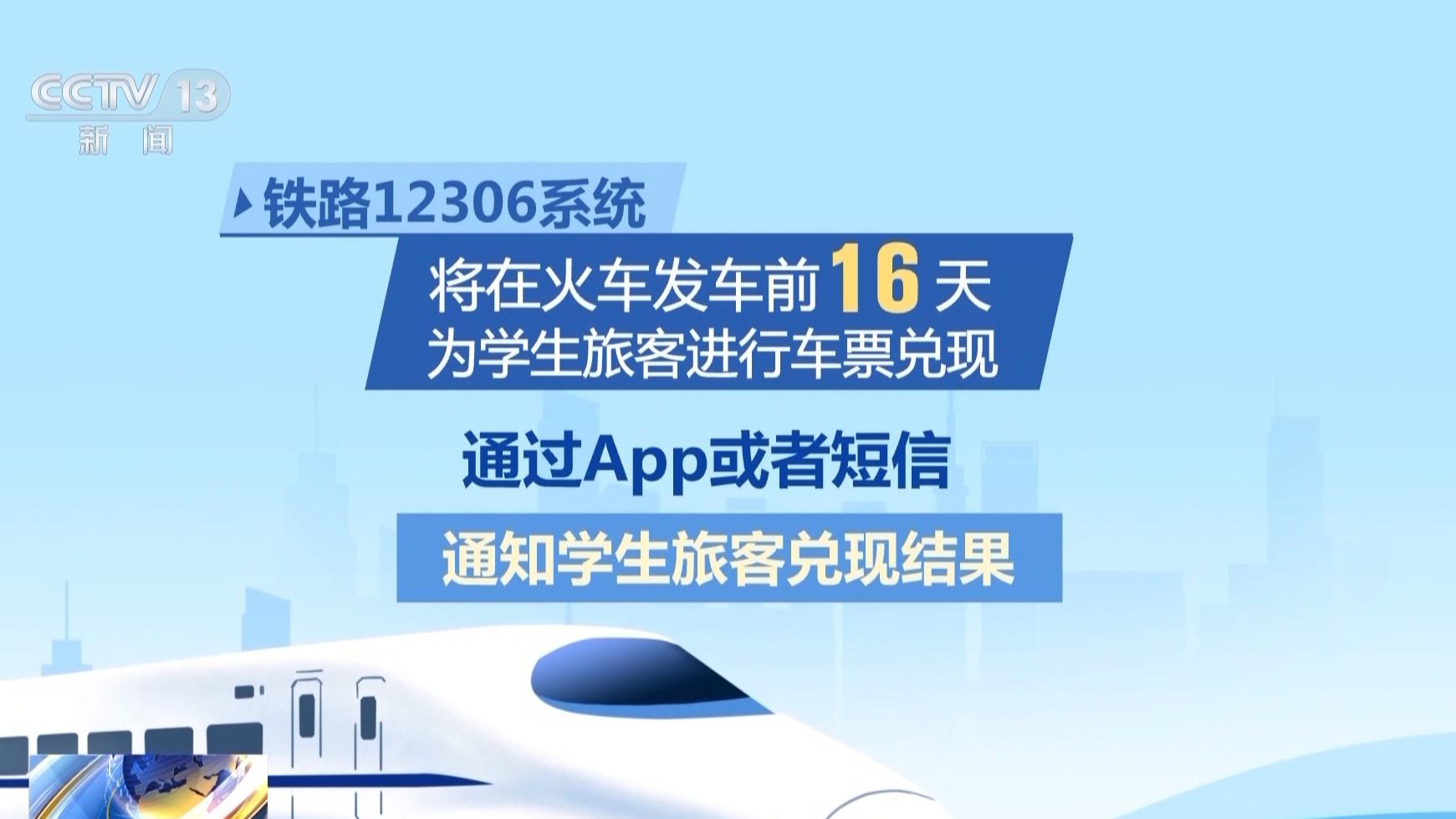 鐵路12306系統(tǒng)將在火車發(fā)車前16天為學(xué)生旅客進(jìn)行車票兌現(xiàn),并通過App通知或者短信通知學(xué)生旅客兌現(xiàn)結(jié)果。車票兌現(xiàn)成功后,學(xué)生旅客需在當(dāng)日23時前,在鐵路12306App中完成預(yù)約購票訂單支付。