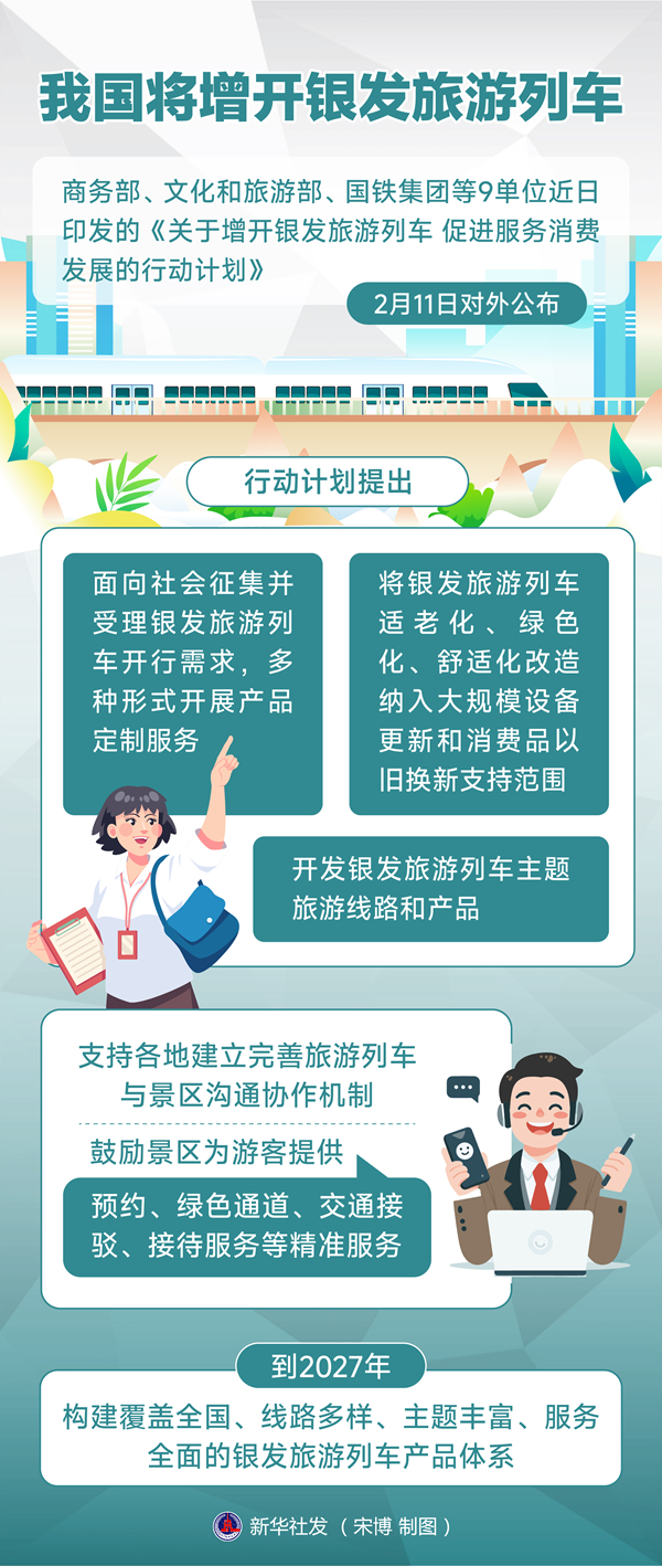 行動計劃提出,充分發(fā)揮我國鐵路網(wǎng)絡(luò)化運營和安全、舒適、便捷優(yōu)勢,健全旅游列車市場化開行服務(wù)保障機制,鼓勵和支持各類社會資本參與銀發(fā)旅游列車投資和運營,擴大服務(wù)供給,積極培育服務(wù)消費新增長點,更好滿足銀發(fā)群體旅游服務(wù)需求。到2027年,構(gòu)建覆蓋全國、線路多樣、主題豐富、服務(wù)全面的銀發(fā)旅游列車產(chǎn)品體系。