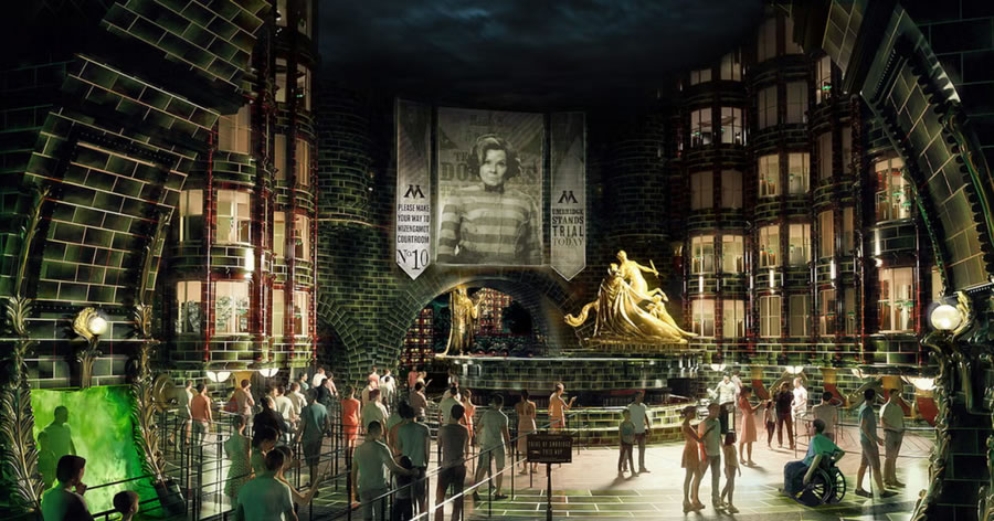 第二個(gè)矚目的新園區(qū)是哈利波特魔法世界(The Wizarding World of Harry Potter)的擴(kuò)建園區(qū):并命名為魔法部之謎(Ministry of Magic),項(xiàng)目首次跳出了一期園區(qū)霍格沃茨與對(duì)角巷,深入《神奇動(dòng)物》系列中1920年代的巴黎魔法部。喬治卡爾森(George Carlson)設(shè)計(jì),英國全息視覺公司Holovis打造的 “魔法部時(shí)空電梯(Ministry Time-Turner Elevator)”將無縫穿梭紐約、倫敦與巴黎,采用4D投影實(shí)時(shí)渲染窗外街景,形成極具震撼力的沉浸式魔法場景體驗(yàn)。而 “默默然防御訓(xùn)練(Obscurial Escape)” 多人射擊游戲,需用魔杖擊退熱感應(yīng)投影的黑暗生物,積分實(shí)時(shí)影響勛章等級(jí),將游客互動(dòng)參與性帶入全新的高度。