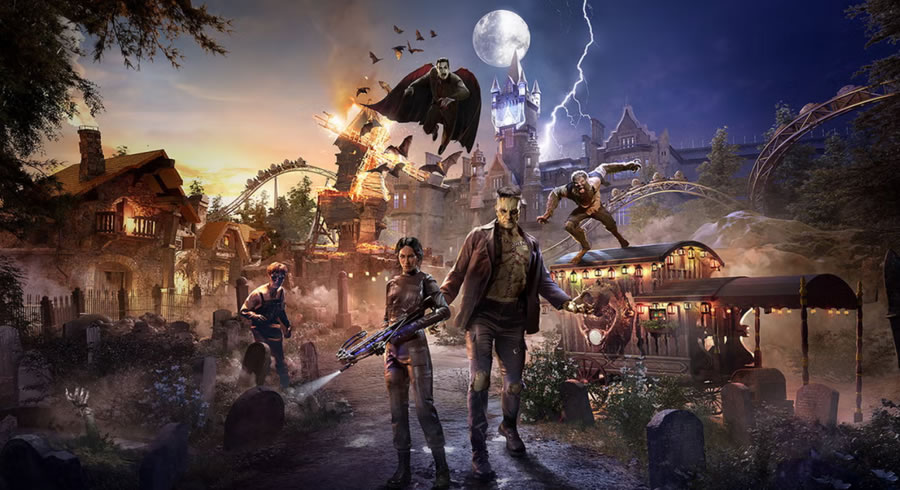 另一個(gè)園區(qū)黑暗宇宙(Dark Universe)則致敬環(huán)球經(jīng)典怪物電影,暗黑美學(xué)貫穿始終。標(biāo)志性設(shè)施 “德古拉的詛咒:自由墜落(Dracula’s Curse: Freefall Tower)” 結(jié)合全息投影與百米極速墜落,游客在驚悚劇情中與吸血鬼纏斗; “科學(xué)怪人:命運(yùn)實(shí)驗(yàn)室(Frankenstein’s Fate Lab)” 則為多結(jié)局互動(dòng)劇場,觀眾通過手機(jī)APP投票決定人造人的善惡,觸發(fā)不同逃生路線。