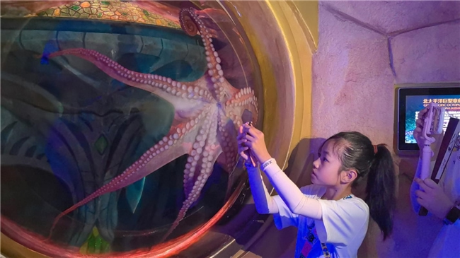 游客在失落的空間水族館近距離觀賞北太平洋巨型章魚