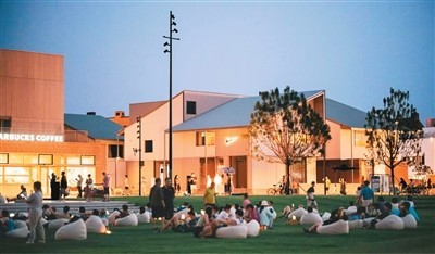游客在秦皇島阿那亞社區(qū)內(nèi)的街區(qū)廣場上休閑。