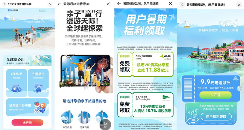 暑期,天際通為計劃出境游的用戶特別推出了“全球隨心用”活動,境外流量9.9元包天,每天有5GB高速流量,活動覆蓋港澳、新馬泰、日韓、歐洲、澳大利亞、美國(本土地區(qū))等50個國家地區(qū),多重優(yōu)惠讓境外出行更劃算。華為天際通還為出行亞洲、歐洲的用戶提供了多地旅游優(yōu)惠權(quán)益,涵蓋機票酒店、旅游景點、吃喝玩樂等各個方面,更多精彩等你來發(fā)現(xiàn)!