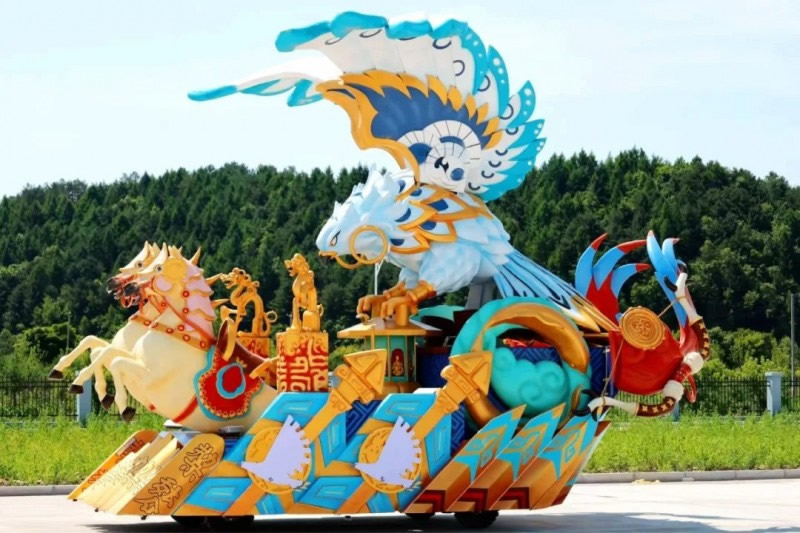 花車設(shè)計(jì)不僅注重視覺沖擊力,更融入動(dòng)態(tài)特效:虎頭擺動(dòng)、翅膀扇動(dòng)、雪花機(jī)噴灑等細(xì)節(jié),讓靜態(tài)的造型煥發(fā)生命力。夜幕降臨時(shí),花車更以夜光效果點(diǎn)亮林海,為觀眾呈現(xiàn)一場(chǎng)光影交織的奇幻盛宴。