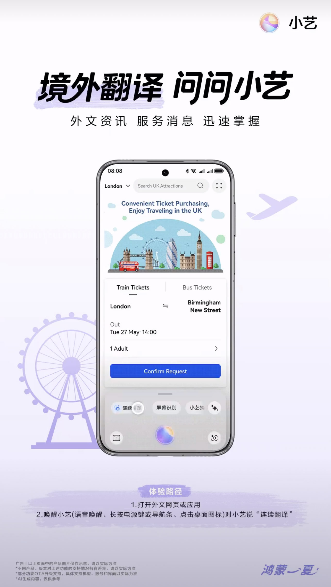 境外游時,難免遇到瀏覽當地網站訂票、打車時卻發(fā)現根本看不懂的麻煩。升級到鴻蒙 5.1的用戶這時就可以用小藝“連續(xù)翻譯”功能解決。長按小藝導航條,點擊“連續(xù)翻譯”服務即可體驗,一次開啟就能實現屏內邊瀏覽邊翻譯的系統(tǒng)級連續(xù)翻譯體驗,支持截屏、文檔、瀏覽器等全場景的連續(xù)性翻譯。