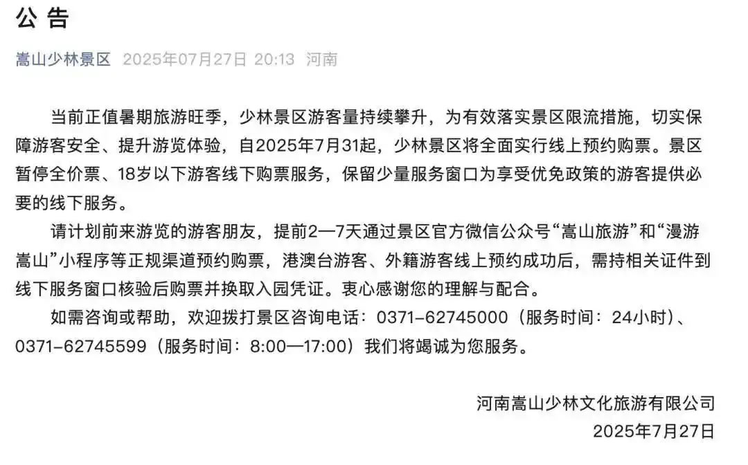 7月27日,嵩山少林景區(qū)官方公眾號發(fā)布最新消息顯示:當前正值暑期旅游旺季,少林景區(qū)游客量持續(xù)攀升,為有效落實景區(qū)限流措施,切實保障游客安全、提升游覽體驗,自2025年7月31日起,少林景區(qū)將全面實行線上預約購票。景區(qū)暫停全價票、18歲以下游客線下購票服務,保留少量服務窗口為享受優(yōu)免政策的游客提供必要的線下服務。