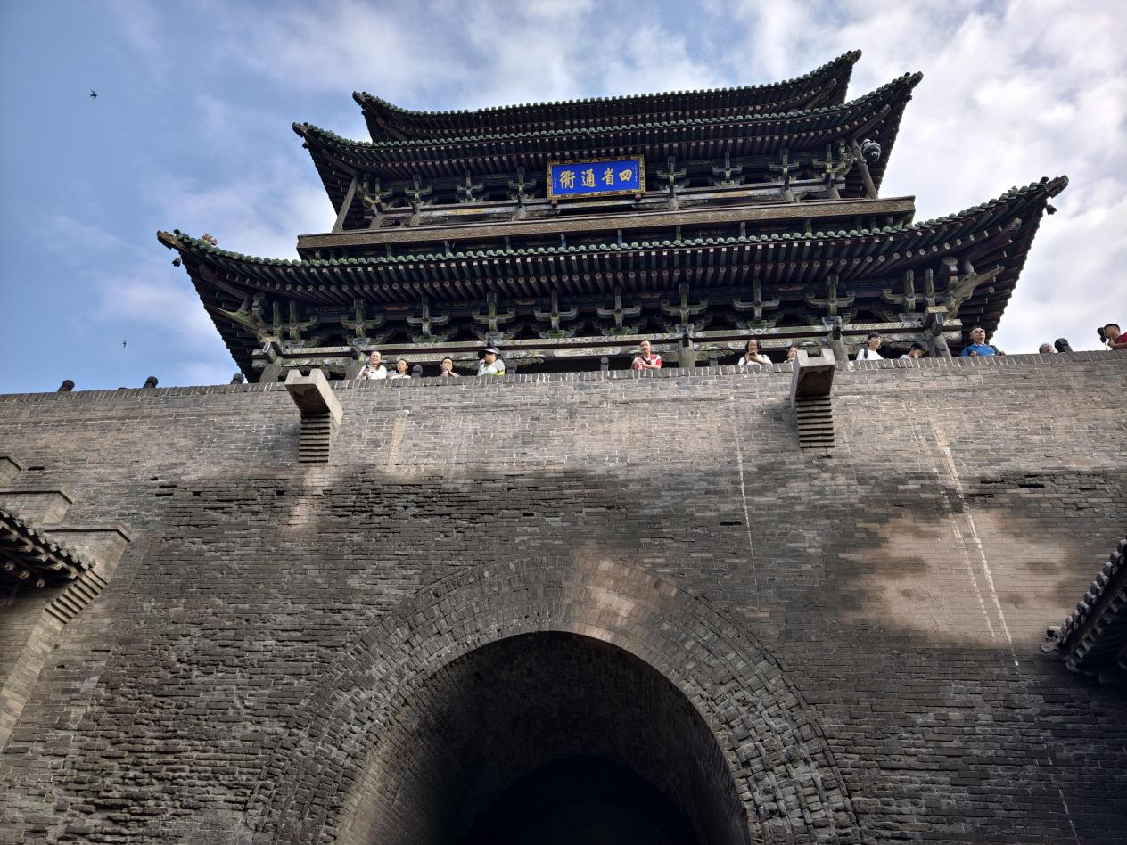 登上古城墻遠(yuǎn)眺,6000多米長的城墻巍峨挺拔。據(jù)工作人員介紹,現(xiàn)在我們看到的城墻基本上保留了明代的建筑形制,外墻包磚內(nèi)墻夯土。古城內(nèi)以南大街為軸線,四大街、八小巷、七十二條蚰蜒巷縱橫交錯(cuò),民居、客棧、票號(hào)、鏢局等呈東西對(duì)稱分布。青磚路面以及上面深深的古車轍印,是古城“四省通衢”的重要見證。