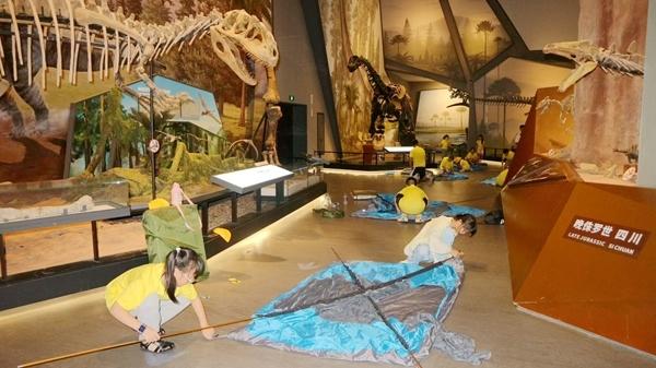 為應(yīng)對(duì)夜場(chǎng)活動(dòng)數(shù)量多、而館內(nèi)工作人員有限的情況,博物館引入專(zhuān)業(yè)研學(xué)團(tuán)隊(duì)負(fù)責(zé)夜宿活動(dòng)的策劃與執(zhí)行。30組親子家庭在破冰活動(dòng)后,跟隨專(zhuān)業(yè)講解員走進(jìn)展廳,深入了解脊椎動(dòng)物的演化歷程;體驗(yàn)4D電影和化石盲盒等手工制作;最后,在博物館鎮(zhèn)館之寶——長(zhǎng)達(dá)26米的馬門(mén)溪龍骨架化石下搭起帳篷,伴著生動(dòng)的睡前故事進(jìn)入夢(mèng)鄉(xiāng)。