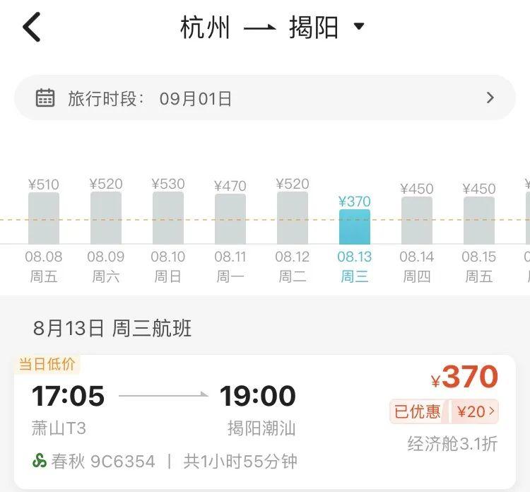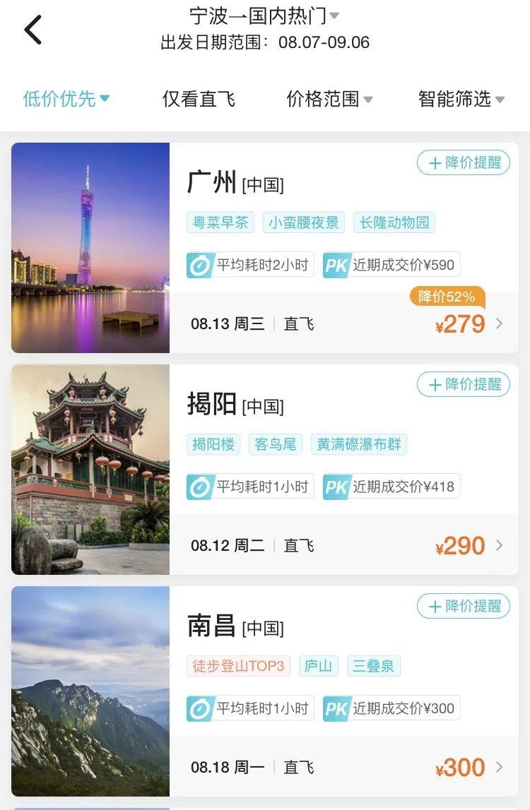 8月中旬,寧波飛廣州、揭陽(yáng)的機(jī)票價(jià)格2字頭就可拿下,比如8月13日寧波飛廣州最低票價(jià)僅需279元(不含稅),8月12日寧波直飛揭陽(yáng)機(jī)票價(jià)格最低僅需290元(不含稅)。