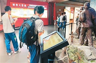 游客步入館內(nèi),仿佛踏入歷史的洪流。全息投影、文物陳列、場(chǎng)景復(fù)原等技術(shù)打造出數(shù)字化展陳空間。曾經(jīng)只能在文字和圖片中描繪的歷史場(chǎng)景,如今栩栩如生地呈現(xiàn)在眼前。在秘密大營(yíng)救展區(qū),雕塑還原文化名人在游擊隊(duì)員護(hù)送下離開的場(chǎng)景,當(dāng)觀眾點(diǎn)擊多媒體互動(dòng)裝置選擇不同的撤退路線時(shí),大屏幕會(huì)動(dòng)態(tài)還原當(dāng)時(shí)驚險(xiǎn)的轉(zhuǎn)移路徑,讓人如同身在其中,真切感受到革命先輩在槍林彈雨中的英勇機(jī)智。來(lái)自廣州的黃同學(xué)說(shuō):“有了這些多媒體設(shè)備,讓我更直觀了解到當(dāng)時(shí)槍林彈雨的危險(xiǎn)場(chǎng)景,也更好地學(xué)習(xí)了東江縱隊(duì)的歷史。”