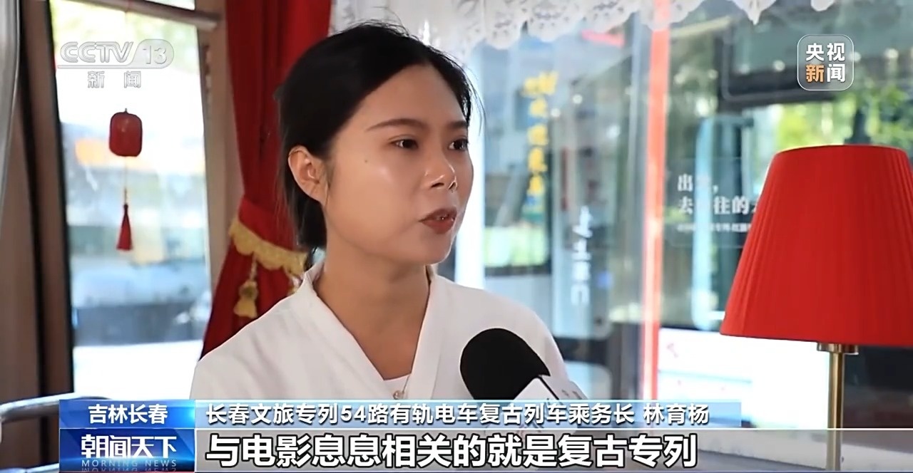 長(zhǎng)春文旅專(zhuān)列54路有軌電車(chē)復(fù)古列車(chē)乘務(wù)長(zhǎng) 林育楊:與電影息息相關(guān)的就是復(fù)古專(zhuān)列。它的起始站就是長(zhǎng)影舊址博物館,途經(jīng)東風(fēng)大街、創(chuàng)業(yè)大街、南陽(yáng)路,都是熱播劇的取景地。