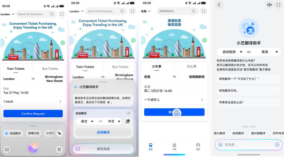 當(dāng)然,小藝的能力遠(yuǎn)不止于此。海外出行時,用戶翻閱外文網(wǎng)站或使用外文App,只需長按屏幕底部小藝導(dǎo)航條,點(diǎn)擊“連續(xù)翻譯”,或直接喚醒小藝后說“連續(xù)翻譯”,即可體驗邊瀏覽邊翻譯的效果。當(dāng)需要與外國友人進(jìn)行面對面溝通時,使用小藝的面對面翻譯幫你輕松應(yīng)對跨語言溝通場景;遇見不認(rèn)識的外文路牌、菜單,拍照發(fā)給小藝翻譯助手秒翻譯。