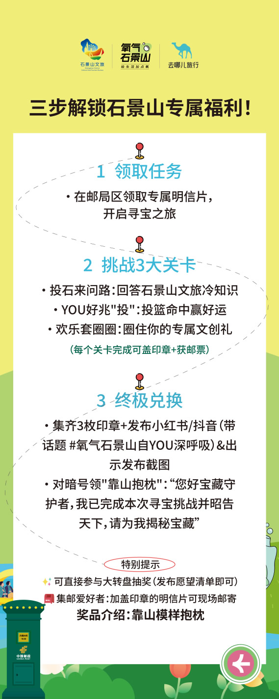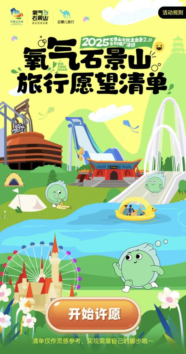 在“去哪兒”旅行APP上線“氧氣石景山”文旅專題頁,不僅整合酒店榜單、景區(qū)門票、優(yōu)質(zhì)攻略等核心文旅資源,更特別設(shè)置石景山區(qū)對(duì)口支援和協(xié)作地文旅產(chǎn)品版塊,實(shí)現(xiàn)“石景山推廣+支援地區(qū)助銷”雙重價(jià)值。同步推出的“旅行打卡愿望清單”H5,線上用戶可點(diǎn)亮自己的石景山旅游心愿,生成專屬旅行愿望清單;在高校路演活動(dòng)中,大學(xué)生可分享H5到社交媒體作為參與活動(dòng)的入場(chǎng)券——既為高校活動(dòng)預(yù)熱,更成為高校路演入場(chǎng)憑證,串聯(lián)起“線上互動(dòng)-線下參與”的閉環(huán)。