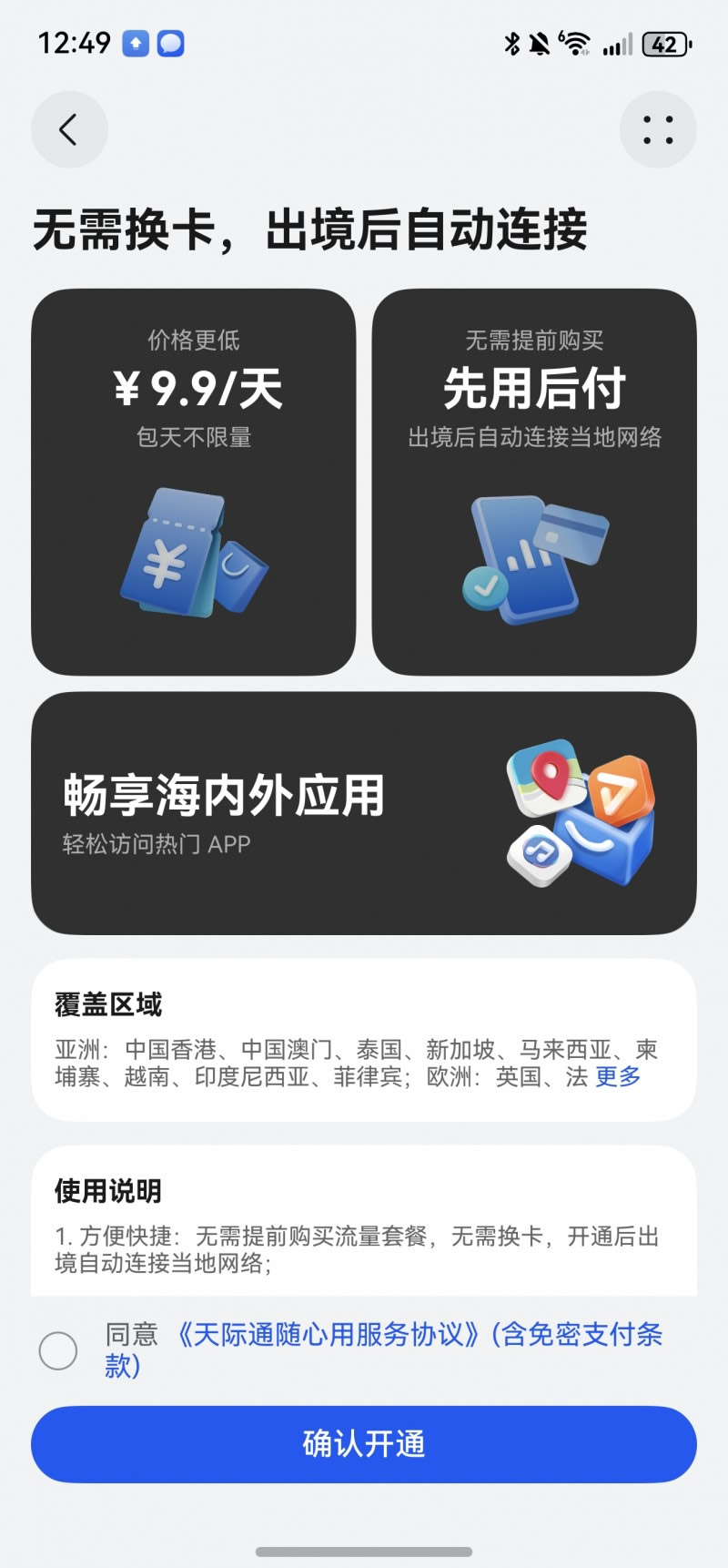 緊接著,天際通第二重禮·隨心用——9.9元/天多地流量隨心用,針對多地旅行或深度游用戶,天際通推出「9.9元/天多地流量隨心用」服務(wù),用戶無需換卡,支持先用后付,按需付費(fèi)。每24小時(shí)僅需9.9元,享5GB高速流量+常速不限量,覆蓋歐美、東南亞等50個(gè)熱門地區(qū);單次開通長期有效,不用不扣費(fèi),聯(lián)程轉(zhuǎn)機(jī)無縫銜接。